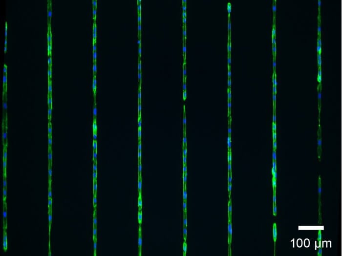 在20 µm lines上培養(yǎng)的人臍靜脈內皮細胞(HUVEC)。細胞接種前用Matrigel®進行預包被。孵育兩天后,進行固定和染色。藍色:細胞核(DAPI),綠色:F-肌動蛋白細胞骨架(Alexa 488偶聯物),10倍物鏡,寬場熒光成像。